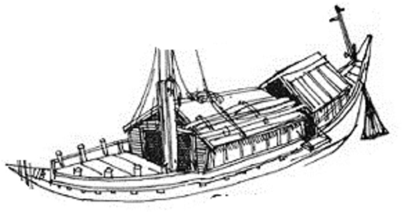On a small sheet of Bangladesh, the vessel called "Ghasi" . A Dictionary of the world’s Watercraft from Aak to Zumbra called "Вadjra". See the drawings. “Houseboat” on the Ganges River and delta area that was used initially mainly by local officials and for ceremonial purposes; some types carried cargo. Reported from at least the 16th century; still in use today, not only for living quarters but as mobile cinemas, for educational purposes, and by holy men collecting donations. Spoon -shaped with a high stern and low bow; bottom either flat or rounded, no keel. Large, low cabin aft, the amenities and construction commensurate with the status of the user. When used as a cook boat, 2 brick hearths incorporated. Bowers, as many as 16, worked forward of or above the cabin using bamboo oars with disc-shaped blades. Steered with a huge oar from the roof or by a large, triangular balanced rudder. When sailed, set a square mainsail with a bamboo yard and a topsail; mast stepped amidships. Crew of 9-16. Often accompanied by a fleet of smaller boats, e.g., a pallar as a kitchen boat and a small panshi as a tender. Reported lengths 7.6-18.2m, widths 2.44-5m, depths 1.22-1.88m; shallow draft.