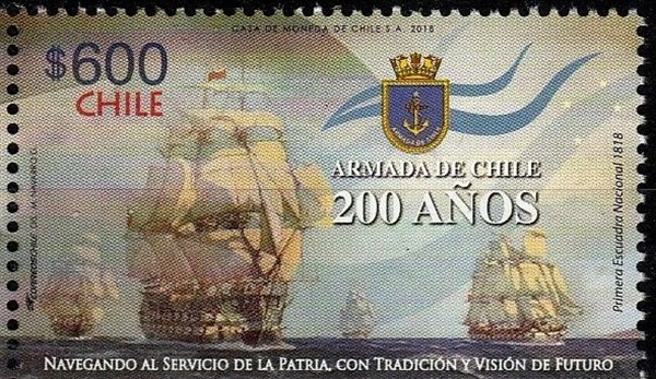 The $20 stamp is designed after a painting made by Thomas Somerscales (1842-1927) https://en.wikipedia.org/wiki/Thomas_Somerscales and show us the First Chilean Navy Squadron, the squadron was formed in 1817 with nine ships and the Squadron was decommissioned in 1826. I can’t find if the depicted ships on the painting have been identified. https://en.wikipedia.org/wiki/First_Chi ... n#Build_up