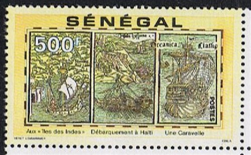 Senegal issued a set of stamps for the 500th anniversary of discovery of America. The 500F stamp shows us watercraft depict on Columbus letter on his first voyage.