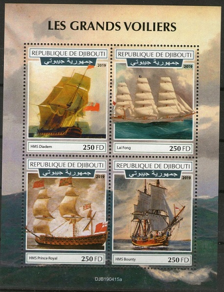 Djibouti issued in 2019 a stamp issues with “tall ships”: PROVIDENCE 1775-1000 fd- viewtopic.php?f=2&t=8797; On the MS are depict ROYAL CLIPPER - viewtopic.php?f=2&t=15119; HMS «DIADEM» 1782-250fd - viewtopic.php?f=2&t=16942; LAI FONG - 250fd- viewtopic.php?f=2&t=16944#!lightbox[gallery]/2/; PRINCE ROYAL HMS 1610-250fd- viewtopic.php?f=2&t=12807; BOUNTY HMS - viewtopic.php?f=2&t=8655;