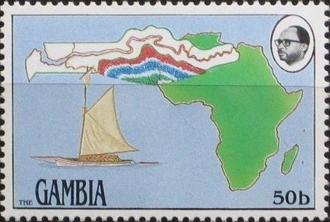 50B shows us a map of Africa and with on top inserted a map of Gambia. On the bottom of the stamp is loaded, what looks like bags of groundnuts, which is a cutter-rigged vessel under sail.