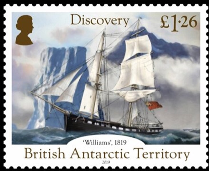 19 February 1819 marked the first sighting of land south of 60° latitude. The British Master Mariner, William Smith, sighted what is known today as the South Shetland Islands. He was on board his ship WILLIAMS which is depicted in the first of this three-part stamp set. Built-in Blyth, the WILLIAMS was then a state-of-the-art sailing vessel. After having been ridiculed for his discovery by non-believers, Smith reached the Islands again and on 16 October 1819 made the first recorded landing on Antarctic territory.