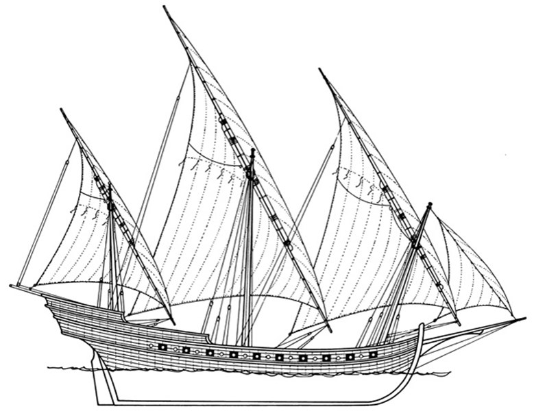 Bokeljski šambek XVII – XVIII.st century. it was an Adriatic and Mediterranean merchant and warship sailing rowing boat, which served the Bokelj family in protecting trade convoys from pirate attacks. Despite the bow linings, wider hull, and larger draft than pirate ships, it was fast and agile. With oars used when there was no wind, it was powered by Latin sails of as much as 650 m2. It was 42.5 m long, 7.2–9 m wide, 2.1 m high at the side, up to 2 m wide, up to 300 t heavy, armed with twenty or more cannons. It had a small crew, 10-12 members, and as a protective convoy ship more than 60 members