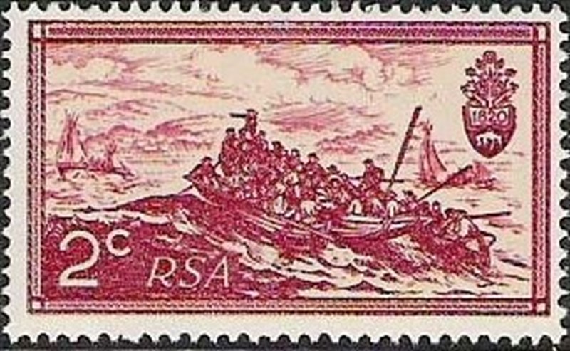 The stamp issued by South Africa showing the first settlers landing in Algoa Bay in 1820 is designed after a painting made by Thomas Baines. The landing of British settlers in 1820: The landing boats belong to the first British immigration ships “NAUTILUS” and “CHAPMAN”, which entered Algoa Bay (Port Elizabeth) on March 10th, 1820. The ships were accompanied by HMS “MENAI”.