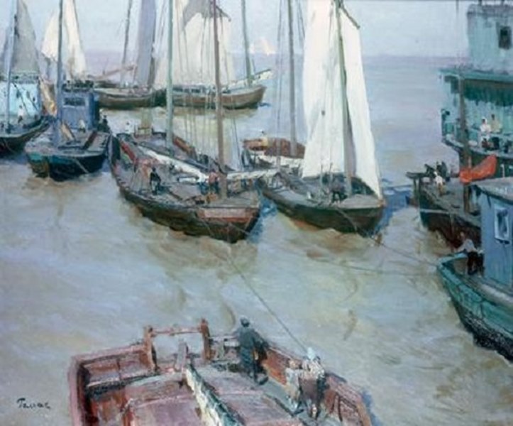 The painting shows barges, it looks that she are towed alongside a wharf on a river, but any information on the painting I could not find. The artist was at that time mostly working around the Caspian Sea.