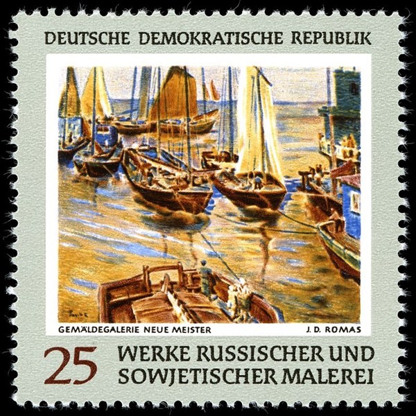 This stamp of the DDR shows us a painting by J.D. Romas. (1902 – 1969) painted in 1963.