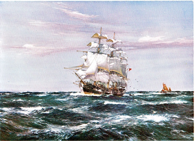 MALBOROUGH, 1,402 registered tons, length 175ft 5in, beam 41ft 5in, depth 29ft 1in.Costructed of wood at T.W. Smith's Tyne yard for T.W. Smith's shipping service to India. An early Blackwall frigate. She was built in 1846, for easy conversion to a fifty guns naval frigate with scantlings pierced for gun ports. The Blackwall frigates built by Smith, Green (Blackwall Line) and Wigram were 500 tons larger than the London passenger ships of their day. MALBOROUGH entered the Indian trade carrying passengers and troops to Calcutta and Madras. In1854, she made one voyage to Australia because of the press of passengers in the Gold Rush. She carried 325 passengers and reached Melbourne in 78 days from the Lizard. Her return journey via Cape Horn was also a creditable 83 days. In 1869. she was withdrawn from service and converted to a coal hulk at Gibraltar. The design stamp is made after painting of Jack Spurling.