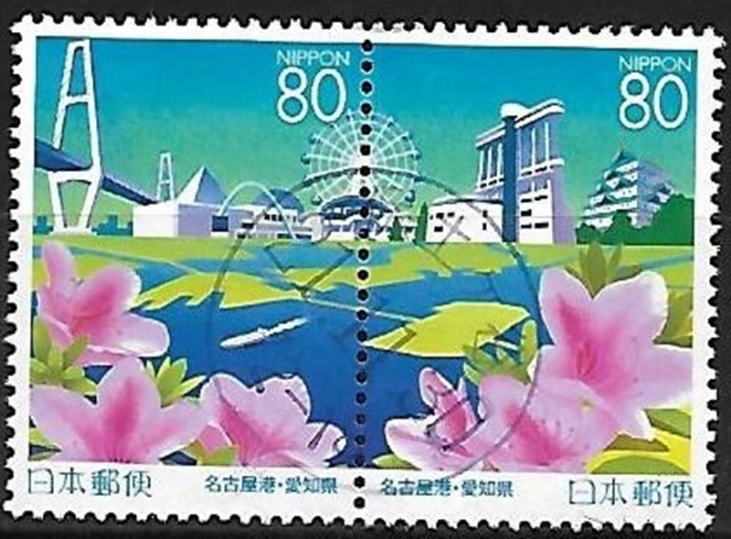 Three stamps of this set show us vessels. Two are identified the FIJI and the training vessel NIPPON MAR II. Of the last you can clearly see the blue band around the hull from the figurehead, the only Japanese tall ship has. The vessel depicts on the Nagoya Port looks like a bulker, but is not identified.