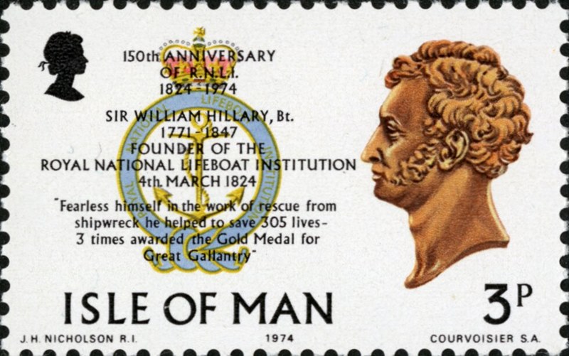 The Isle of Man issued four stamps in 1974 for the 150th Anniversary of the Royal National Lifeboat Institution, three stamps show lifeboats, the 3p stamp shows the founder of the RNLI.