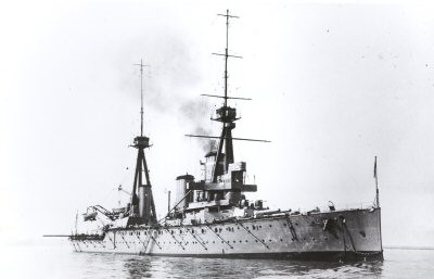 The ships in view are (Left to Right) H.M.S. Carnarvon, H.M.S. Invincible, H.M.S. Inflexible