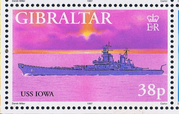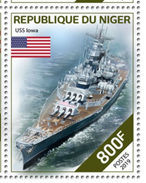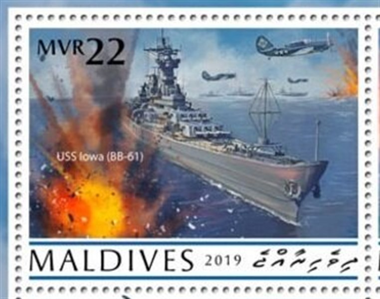 Maldives 2019 sMVR22 sg?, scott? (The unnamed vessel is also IOWA) and she is also depict on the Miniature Sheet in the margin.