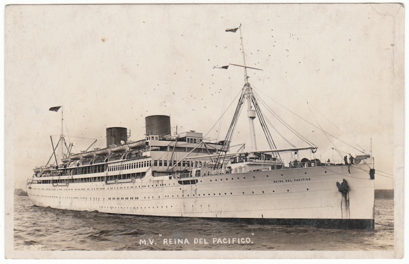 A well-known British liner, the P.S.N.C.'s Reina del Pacifico is seen in the centre berth at Callao docks in the aerial photograph reproduced on the 15 centavos stamp of Peru issued in 1936 for the centenary of the Province of Callao. Built in 1931 by Harland and Wolff, Ltd., at Belfast, she has a gross tonnage of 17,707, and a length of 574ft. Her quadruple screws, driven by engines of 22,000 i.h.p., give her a speed of 19 knots. She carried 888 passengers in three classes and served on the Liverpool-West coast of South America. During the war she visited the Far East, North Atlantic, Norway, African West Coast, Suez Canal, and Mediterranean ports. She was bombed on many occasions, but escaped serious damage. Released from Govt control 1946 and returned to builders for overhaul and refit. Explosion in engine room in 1947 during trials which killed 28. Returned to Liverpool-Valparaiso service 1948. Broken up 1958 at Newport, Mon.