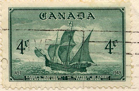 June 24. 1947, was the 450th anniversary of Cabot's discovery, and a single 5 cents stamp was issued by Newfoundland. It depicted the navigator and some of his ship's company looking from the Matthew's deck at Cape Bonavista.