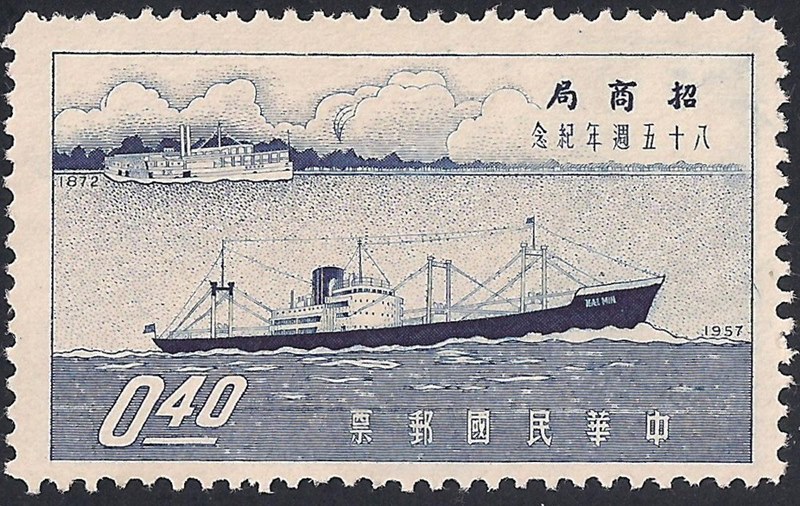 To commemorate the 85th anniversary of the China Merchants Steam Navigation Company, the Nationalist Government of Chiang Kai-shek on the island of Formosa (Taiwan) issued a set of three stamps in December, 1957 These show the latest motorship in the company's service, the Hai Min and one of the firm's early river paddle-steamers, the Kiang Foo. So finely engraved are these designs by Pao Liang-yu of the China Engraving and Printing Works at Taipeh that it is possible to read with a glass the name on the paddle-box.