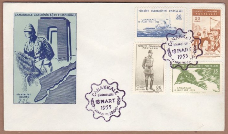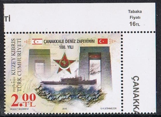 The commemorative stamp depicts the Gallipoli Star medal, Çanakkale Martyrs Monuments in Çanakkale and Famagusta and the minelaying vessel NUSRAT.