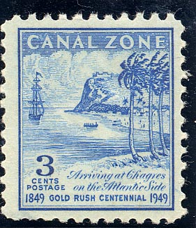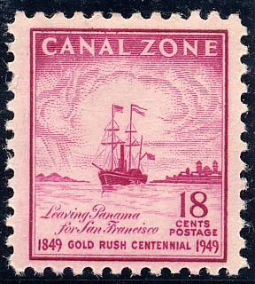 The designs of the four stamps are from sketches prepared by Mr. Meade Bolton and subsequently modified by the U.S. Bureau of Engraving. While they adequately convey the idea, of contemporary drawings made during the gold rush days, I think that a good opportunity has been wasted. The stamp does not do justice to this really historic vessel, one of the first steamers to make the 17,000-mile journey from New York to San Francisco via the Straits of Magellan and Panama. Previous Canal Zone ship stamps have been first-class issues, but this one is a disappointment.