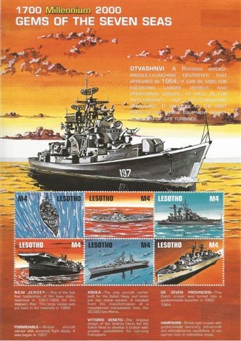 The 16k. stamp shows the Kashin class destroyer Otvazhny, 4,300 tons standard displacement, 5,200 full load. Dimensions: length 470 ft. 9in., beam 52 ft. 5 in., draft 19 ft. Missile launchers: four (2 twin) SA-N-1 for surface to air missiles, Guns: four 3-in.(76 mm). two twin. Anti-submarine weapons: two 12-barrelled MBU forward; two 6-barrelled MBU aft. Torpedo tubes: five 21in. (533 mm.)quintuple amidships for ASW torpedoes.