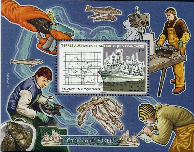 In January 2008 French Southern and Antarctic Territories issued a MS of 2.50 Euro for “Campagne POKER” on the stamp and also in the margin of these ms is depict the factory ship AUSTRAL.