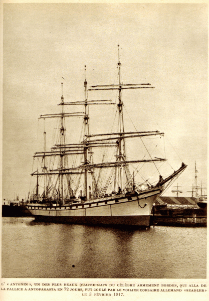 The Antonin was a steel barque built in 1902 by Atel et Chant. de France, Dunkirk, for the well-known owners A. D. Hordes and Son. Her sister ship was named Valparaiso, and both were engaged in the nitrate trade between France and Chile. In 1904 the Antonin sailed from Port Talbot on October 10 and reached Iquique on December 15, a passage of 75 days. This was a wonderful feat but one which she even bettered during the 1914-18 war, when she went from La Pallice (November 18, 1915) to Antofogasta (January 29, 1916)-only 72 days. The following year (1917) she was sunk by the German Seeadler. She was the fourth vessel in Bordes fleet to bear the name Antonin.
