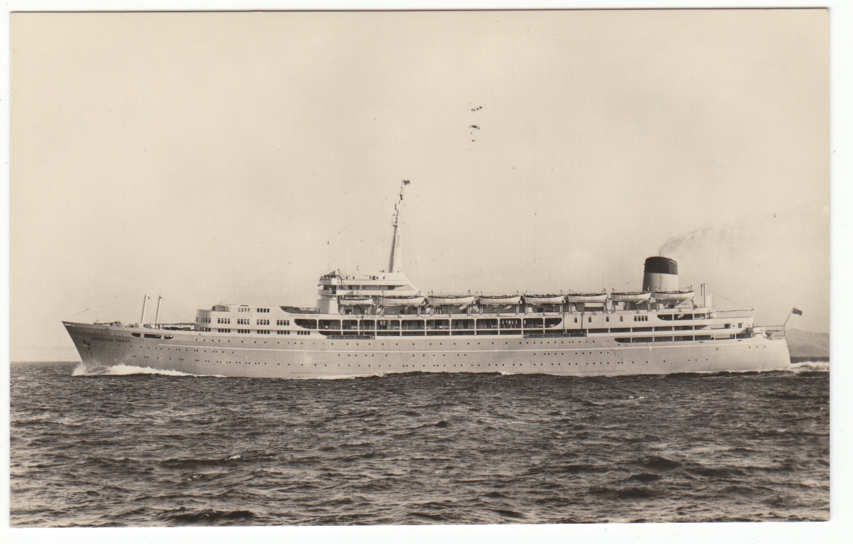 I think that there can be no doubt that the artist has used for his outline of the ships the silhouette of the Shaw Savill liner Southern Cross for the general profile, position of life-boats, funnel and other details correspond. Some structural details, the windows in particular, need to be more clearly elaborated to make a better job of the design.