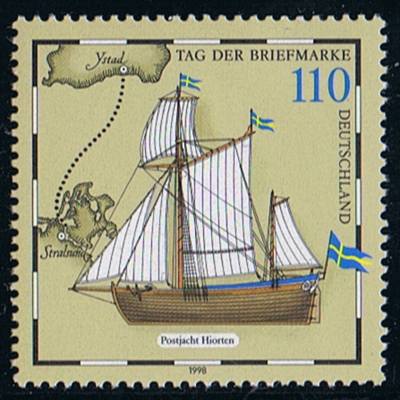 The 20 ore Swedish stamp depicts the Swedish mail packet Hiorten, built in 1692 at Karlskrona. This sloop, the first of several similar craft, sailed between Ystand and Stralsund until 1702. Nowadays she would be termed ketch-rigged, the mainmast forward and the mizzen stepped ahead of the rudder post. The Hiorten had a standing gaffmainsail and a mizzen without booms. The sails were furled to the gaff and the masts through brails. At the masthead she flew a long pennant on a short gaff. The stamp is a fine engraving by Sven Ewert of the drawing by Professor 011e Hjortzberg, now in the Swedish Postal Museum. The design gives an excellent representation of the bluff-bowed postal packet, the first official craft to carry Swedish mail.