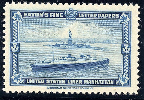 An example of an advertising stamp is shown in this illustration, depicting the United States Lines' Manhattan, which was built and engined by the New York Shipbuilding Company and completed in 1932. She became the U.S. troopship Wakefield during the Second World War, and is a twin-screw vessel of 24,289 gross tons, 705ft. long overall, with a speed of 20 knots. Although an advertisement for a firm of paper makers, few collectors of ship stamps would hesitate to add this stamp to their collection as it is the only one to depict the liner Manhattan.