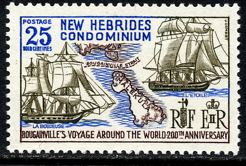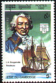 Best known as a French naval officer and navigator although he was a professional soldier until he age of 37. However he had ambitions seawards and so at his own expense he established a colonising settlement in the Falkland Islands. This met with objections from Spain and when Bouganville sailed in December 1766 in command of the frigate La BOUDEUSE and accompanied by the store ship L'ETOILE. His first task was the evacuation of the colony.