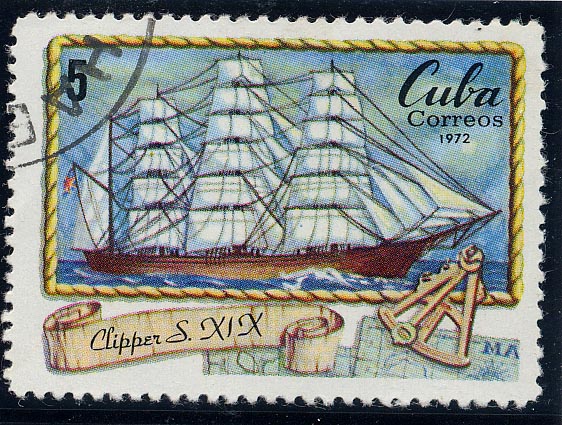 An attractive set of seven stamps from Cuba, depicting ships of various centuries, includes a 19th century clipper ship, which I (E Argyle) believe is the American Great Republic in her original rig. Built by the famous clipper ship builder Donald McKay, her 4,555 tons register, 6,000 tons stowage capacity made her the most famous ship of her time. Her mainmast, from deck to truck, was 228ft. long, the lower mast being 44in. in diameter. All other masts and yards were in proportion, so that she was able to spread 15,653 yards of canvas. She had four laid decks, with 8ft. of headroom between each deck. Her complement was 100 men and 30 boys. She was 325ft. in length, beam of 53ft., and depth of hold of 39ft. The Great Republic had four masts, the after one being fore and aft rigged. A 15-horse power steam engine on the deck was installed for loading and unloading the ship.