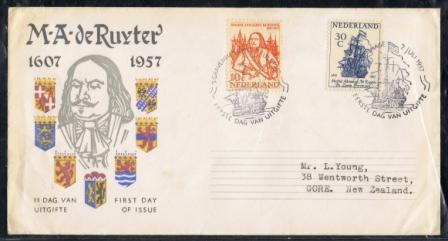 25c plus 15c; De Zeven Provincien was built at Rotterdam in 1665 at the wharf of the Board of Admiralty on the River Maas, by Van der Temple. She was armed with 80 guns, comprising 12 36-pounders, 16 24-pounders, 14 10-pounders, 12 12-pounders and 26 6-pounders. Admiral de Ruyter chose her as his flagship in 1607. The stamp design is based on a painting by Van de Velde the Elder showing officers proceeding to a council of war aboard the de Ruyter's flagship before the Four-Days Battle. The stamp designer has added the gunsmoke for effect; it is naturally not in the original painting. De Zeven Provincien was scrapped in 1694. She has previously appeared on a Netherlands stamp issued in 1957.