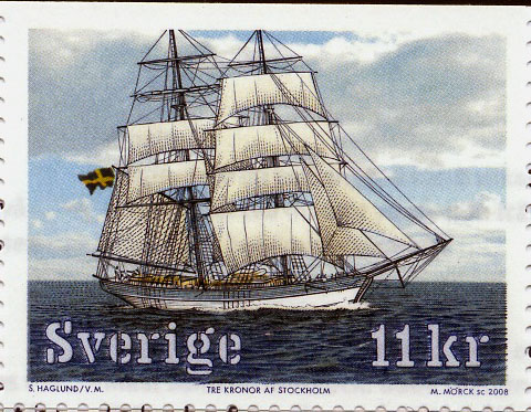 In July 2008 Sweden issued a nice set sailing vessels, and one of this is the newly built TRE KRONOR AF STOCKHOLM, (Three Crowns of Stockholm.)