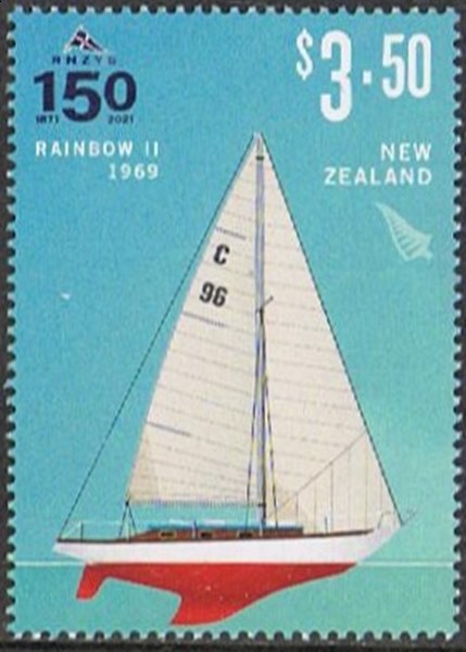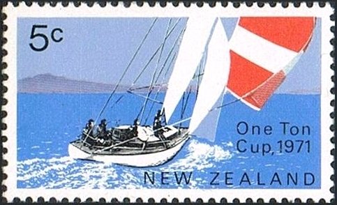 New Zealand commemorated the first challenge in New Zealand waters for the International One Ton Yachting Contest by the issue of two stamps on March 3 1971, the contest taking place from the 5th to 8th of that month. The yacht on the 5 cent value is the Rainbow II, the New Zealand cup winner in 1969, when the races were held off Heligoland. The stamp design shows the winner in her home waters and is based on a photograph of the yacht with Rangitoto, Island in the background.