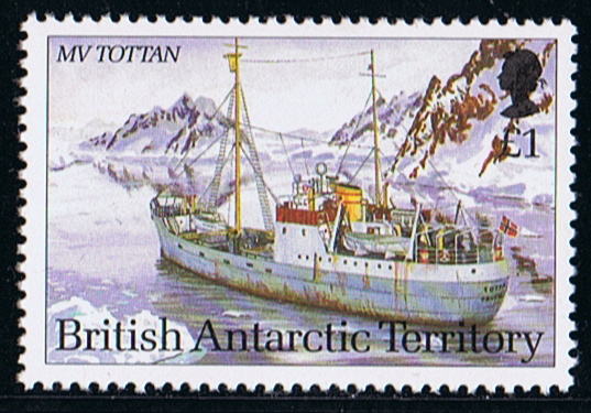 The stamp of the British Antarctic Territory shows the TOTTAN after her refit in 1951.