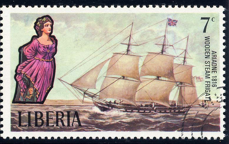 H.M.S. Ariadne (third ship of the name), was a 28-gun sloop, launched at Pembroke Dock on February 10, 1816. She was of 511 tons displacement and carried a crew of 135 men. Her length, beam and draft were 122 ft., 31 ft., and 10 ft. In 1826, Capt. Isham Fleming, of the Ariadne, was tried by court martial at Portsmouth for having purchased a female negro slave at Zanzibar and taken her to sea. The woman mysteriously disappeared off the African coast. Capt. Fleming was dismissed the Service, but was subsequently restored to his rank. The stamp design is similar to the model of the ship in the Science Museum, London, which has the sails furled. However neither stamp nor model depict the ship as a steam frigate which the stamp title claims, mistakenly, as her rating. The model is of special interest, as it is said that its construction and rigging were supervised by Capt. Marryat, the novelist, who commanded the Ariadne from 1828 to 1830. It should be remembered, however, that the correct identification of models is notoriously difficult. After some years service as a coal hulk at Alexandria the Ariadne was sold in 1841. The figurehead is Ariadne, daughter of Minos of Crete, who loved Theseus and gave him the thread by which he escaped from the labyrinth after killing the Minotaur. He married her, but deserted her in Naxos, whence Dionysus carried her off to Zemnos and set the crown he gave her among the stars.