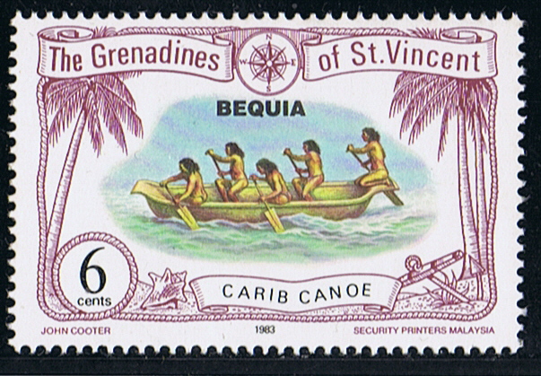 A typical Carib dugout war canoe, with a Carib Indian, appears on the '/2 cent stamp. These Indians were first encountered by Columbus in the Lesser Antilles and adjacent coast of Venezuela. Their name was given to the Caribbean Sea and it is thought that they spread throughout this area from Central Brazil. They were excellent canoe-makers and were one of the few peoples in the New World to employ sails. SG323