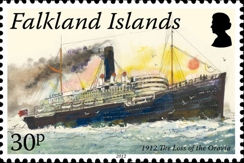 1900-1912. A steel, twin-screw steamer built in 1897 by Harland and Wolff, Ltd., Belfast, for The Pacific Steam Navigation Company, having a gross tonnage of 5,321, net 3,318 on dimensions 421 ft. x 48 ft. 8 in. x 33 ft. depth. Two triple-expansion engines developed 568 nhp. The PSNC held the mail contract for the Falkland Islands colony from 1900 to 1917 and their vessels called at Port Stanley on the outward and homeward voyages to and from Valparaiso or Callao. On November 12, 1912, the Oravia was wrecked on the Billy Rock, Port William, Falkland Islands. No lives were lost.