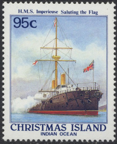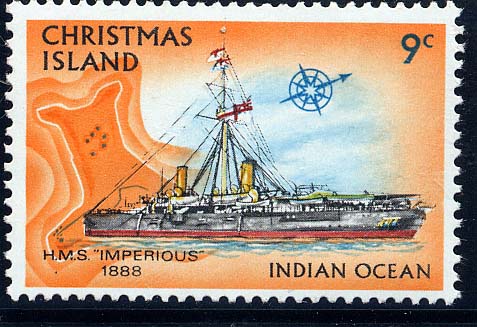 H.M.S. Imperious (according to the stamp), but there has never been a ship of this name in the Royal Navy, it should be Imperieuse, the first of the name being a captured French ship, taken off Spezia on October 10, 1793. The Imperieuse on the stamp was a visitor to the island in June 1888. On this occasion, Capt. H. W. May, R.N. landed at Flying Fish Cove and formally declared Christmas Island to be part of the British Empire. Capt. May's ship was an armoured cruiser, laid down at Portsmouth Dockyard on December 18 1883 and completed in 1886. Steel hulled and copper sheathed, she had a displacement of 8,400 tons. Length was 316 ft., beam 62 ft., and draft 27 ft. 4 in. She was engined by Maudslay. Originally the Imperieuse was armed with four 24-ton; ten 6-inch; four 6-pdr. quick firing; 10 machine guns and two light guns. Later this was changed to four 9.2 in., ten 6-in., and eight 6-pdr. guns. She was renamed Sapphire II in February 1905, when she became a depot ship, but was renamed Imperieuse in June 1905. She was sold to Thos. W. Ward Ltd., of Sheffield on September 24, 1913, for breaking up at Morecambe.