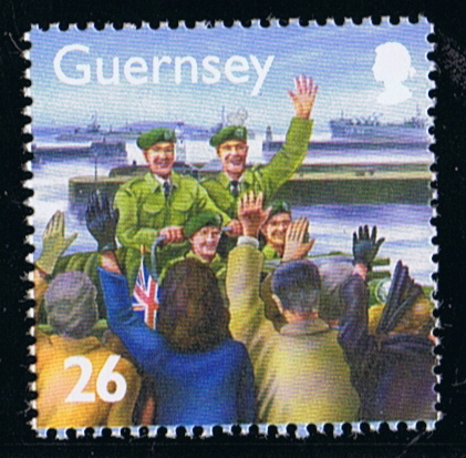 13 May 1945 (other source gives 09 May) the surrender of the German forces on the Channel Islands was signed on board of the BULLDOG. At 07.15 Wednesday 09 May 1945 the destroyer HMS BULLDOG and HMS BEAGLE dropped anchor off the harbour and, on the deck of the former ship, the surrender of the German forces was accepted. The 26p value shows the scene when the first British Army Landrover, carrying four members of the advance party of Force 135 (codenamed “Omelette), was driven up the slipway into town. On the horizon are the islands of Herm and Jethou and in the middle distance, HMS BULLDOG and Castle Cornet.