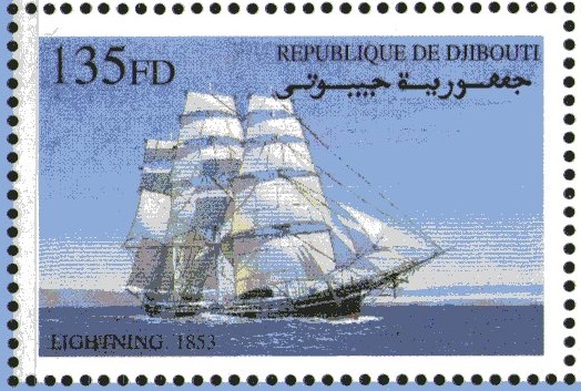 The stamp issued by Turks & Caicos in 2001 with the inscription “The Clipper Ship 1845-1865 (USA) depict the clipper LIGHTNING. The stamp is designed after a painting made in 1930 of the ship by the Japanese painter H Shimidzu, Yokohama. http://blueworldwebmuseum.org/item.php? ... 229&catid=