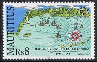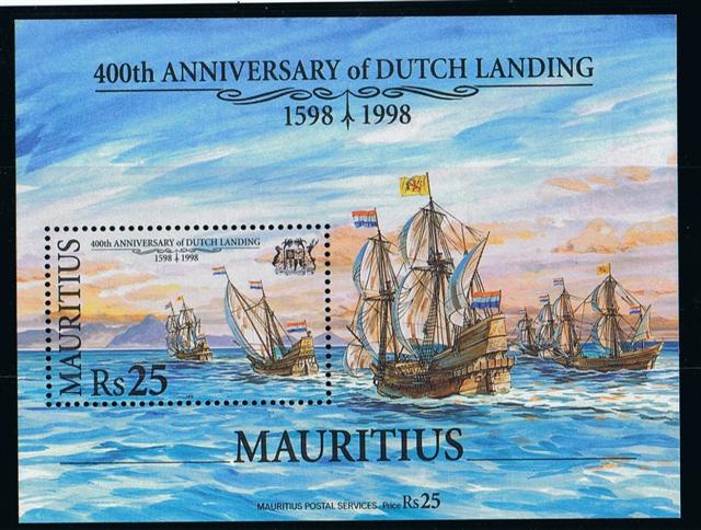 Mauritius issued in 1998 four stamps and a mint sheet for the 400th anniversary of the Dutch landings on the island. The MS depict the Dutch fleet of five vessels when she sighted the island. Most probably the largest vessel in the foreground is the AMSTERDAM with on board Wybrand van Waerwijck, while the vessel sailing ahead is the yacht FRIESLAND.