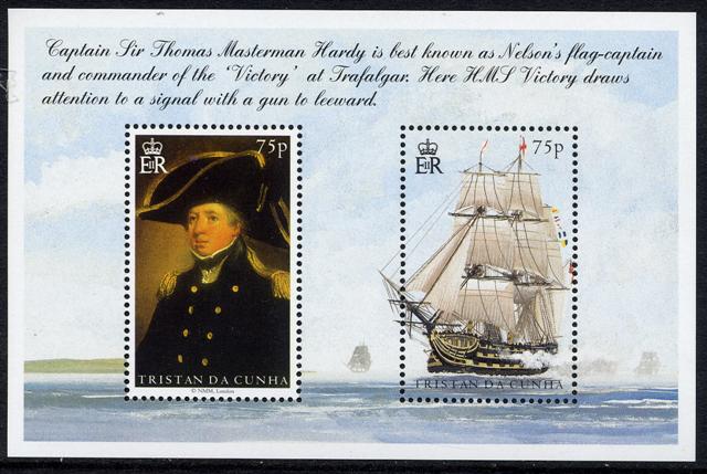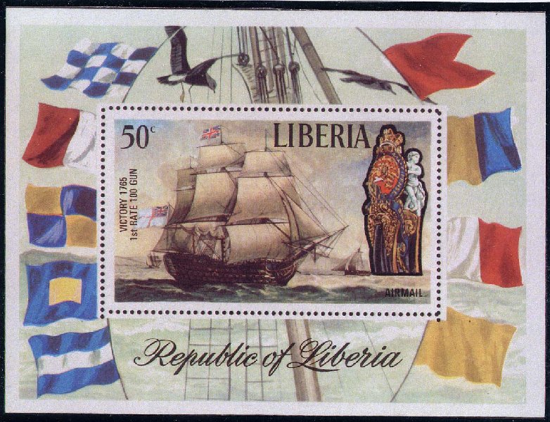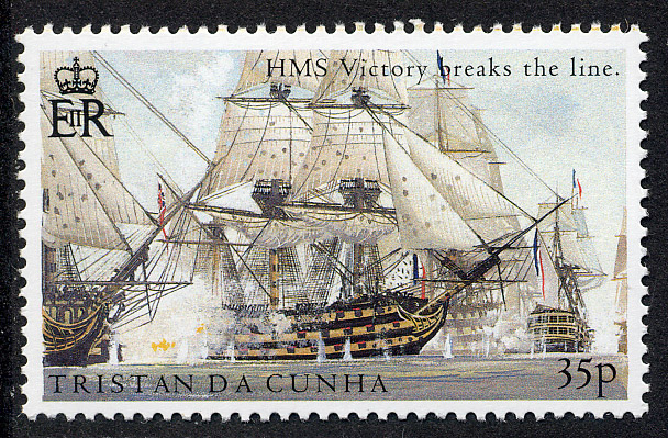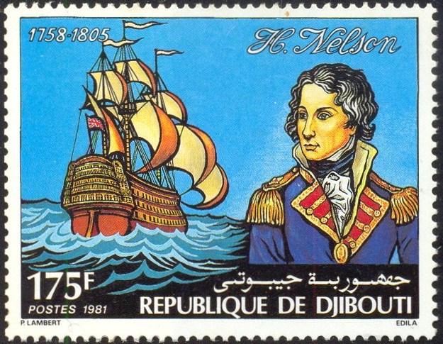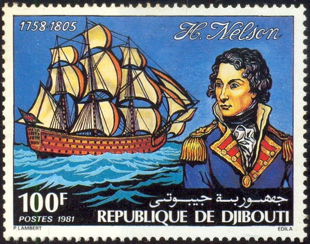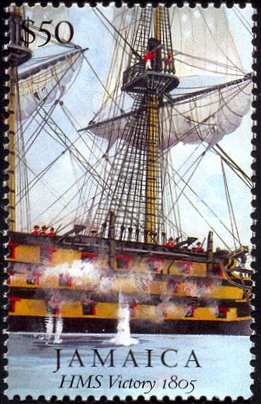 The Nicaragua stamp is also designed after this painting and shows Nelsons flagship HMS VICTORY and in the distance is the HMS CAPTAIN