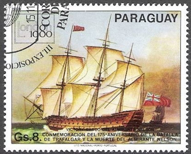 Paraguay issued a stamp in 1980 of Gs8 for the 175th Anniversary of the Battle of Trafalgar. The stamp is designed after a painting in the Maritime Museum Greenwich in England and painted by Monamy Swaine. By this painting is given.