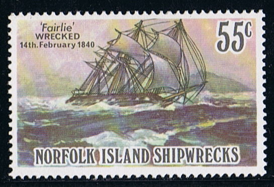 The vessel depict on this stamp is not the FAIRLIE wrecked on 14 Feb. 1840 on Norfolk Island. The depicted ship is most apparently the East India Company ship FAIRLIE, and she was not wrecked on Norfolk Island.