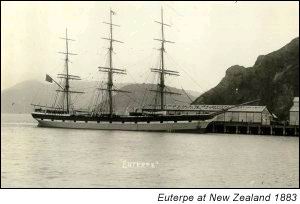 After such a hard luck beginning, Euterpe settled down and made four more voyages to India as a cargo ship. In 1871 she was purchased by the Shaw Savill line of London and embarked on a quarter century of hauling emigrants to New Zealand, sometimes also touching Australia, California and Chile. She made 21 circumnavigations in this service, some of them lasting up to a year. It was rugged voyaging, with the little iron ship battling through terrific gales, "labouring and rolling in a most distressing manner," according to her log.