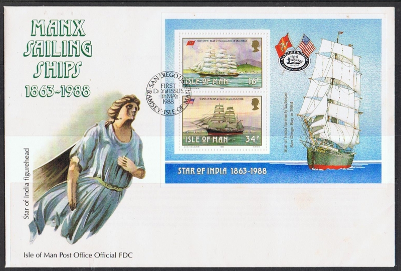 Isle of Man 1988 16p sg385, scott?, MSsg389, scott? ( the 34p stamp shows her as the STAR OF INDIA) 2019 1st sg?, scott?