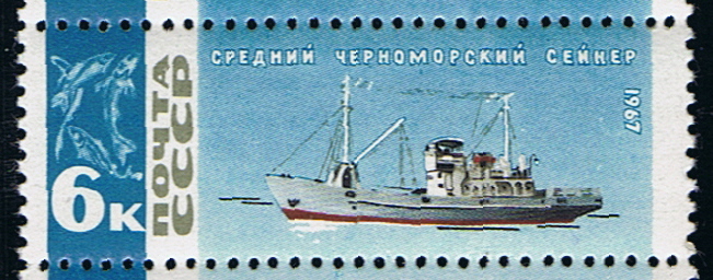 On this stamp is depict a medium size trawler of the Majak type, with reefer capacity of which around 130 vessels were built on several Russian yards.