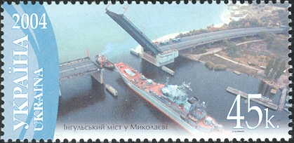 Ukraine issued in 2004 four stamps depicting bridges, the 45k stamp depict the bridge Inhul in Mykolaiv, but also a warship assisted by a tug passing the swing-bridge.