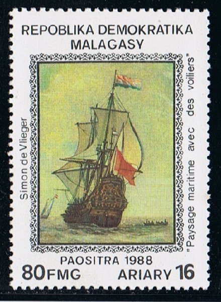 The Malagasy Republic stamp is part of a painting made by the Dutch painter Simon de Vlieger, and depict the Dutch ship-of-the-line BREDERODE off Hellevoetsluis, Netherlands.