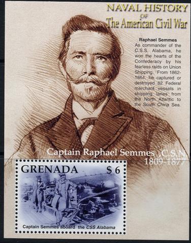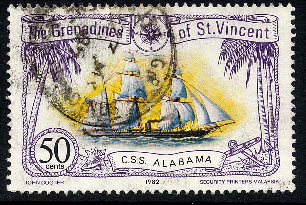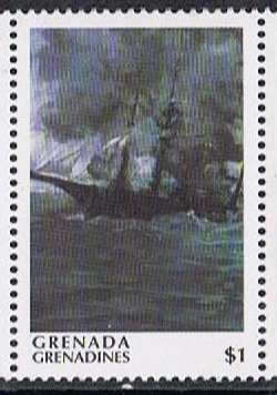 The stamp sheet of Grenada Grenadines gives that the vessel on this stamp is the TECUMSEH built in 1863 for the USA Navy, she was a monitor, while the vessel on the stamp clearly shows us a sailing vessel.