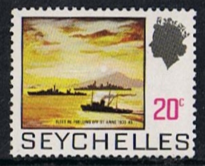 On the stamp she is showed re-fueling off Seychelles during World War II with HMS BELFAST and HMS RAPID.
