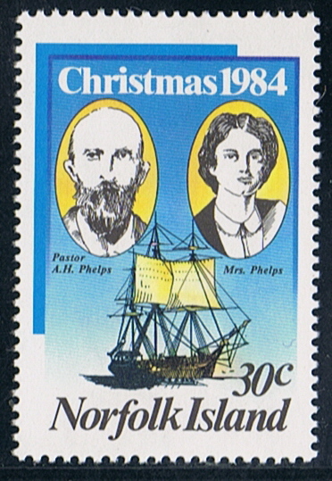 On the stamp a vessel is depict, can it be the CANTON? (she is also on a stamp of the island 1985 20c sg 361). A photo of the CANTON in the book Sealers and Whalers in New Zealand waters, looks of the ship on the stamp is the same, but it can be also the ship on which the Phelps family arrived on the island in 1884, but the name of the vessel on which they arrived I could not find. (most probably the shipsname is lost, not one book what I have consulted on Norfolk Islands gives the name of the vessel, and most probably a ship from that time is depict on the stamp.)